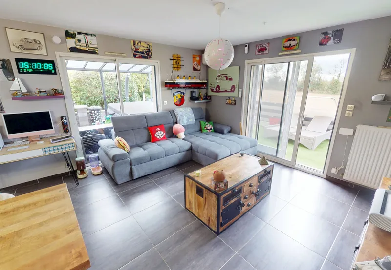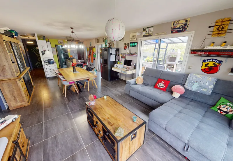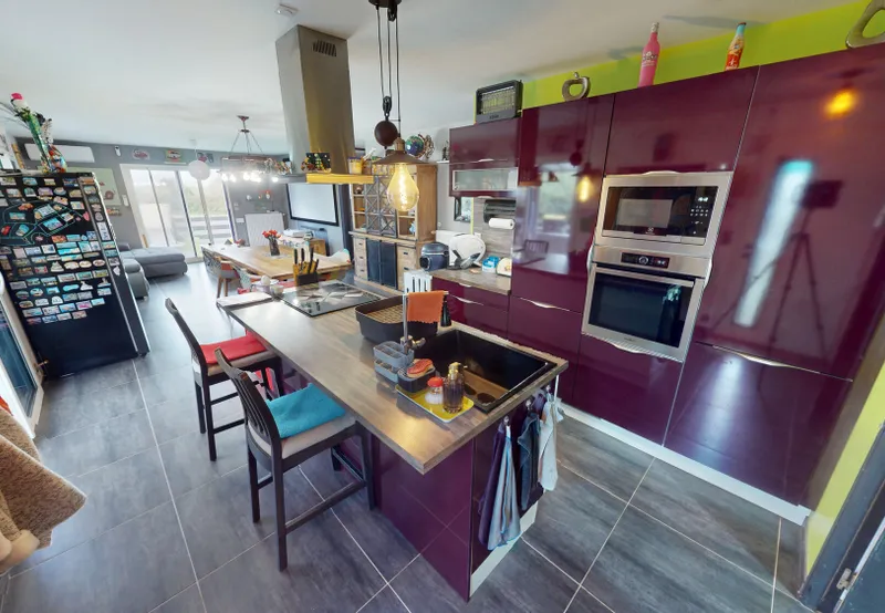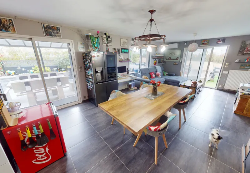 Construite en 2016 (normes RT 2012), cette maison offre une pièce de vie lumineuse de 46 m², exposée Sud / Sud-Ouest, comprenant un séjour / salle à manger et une cuisine américaine aménagée et équipée ouverte.