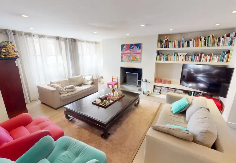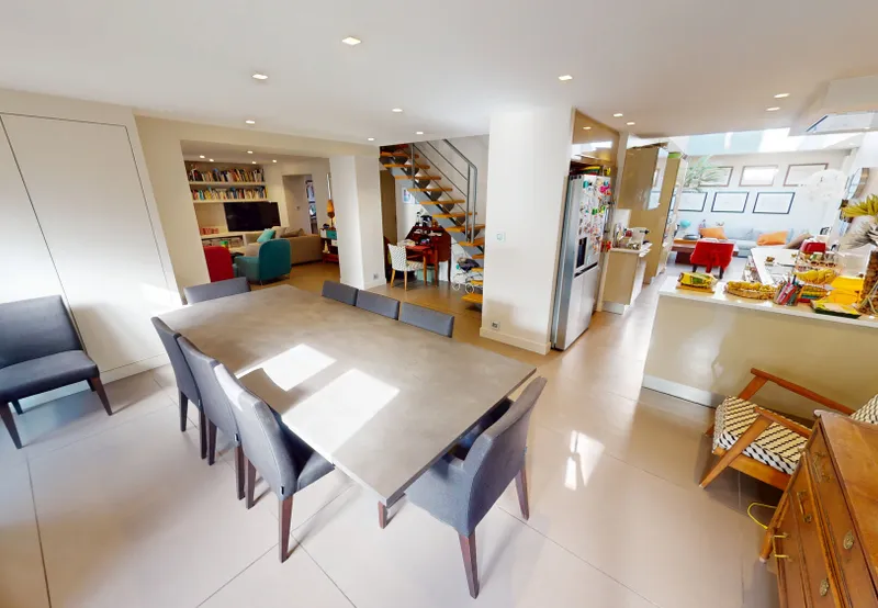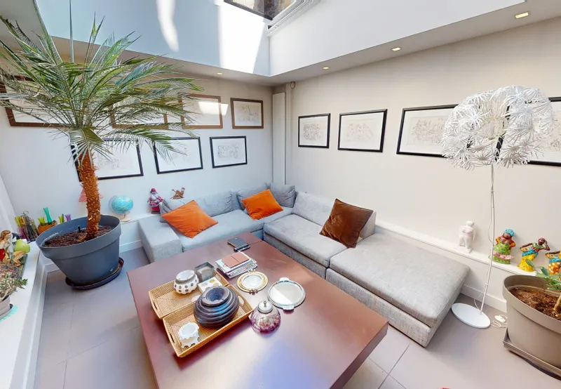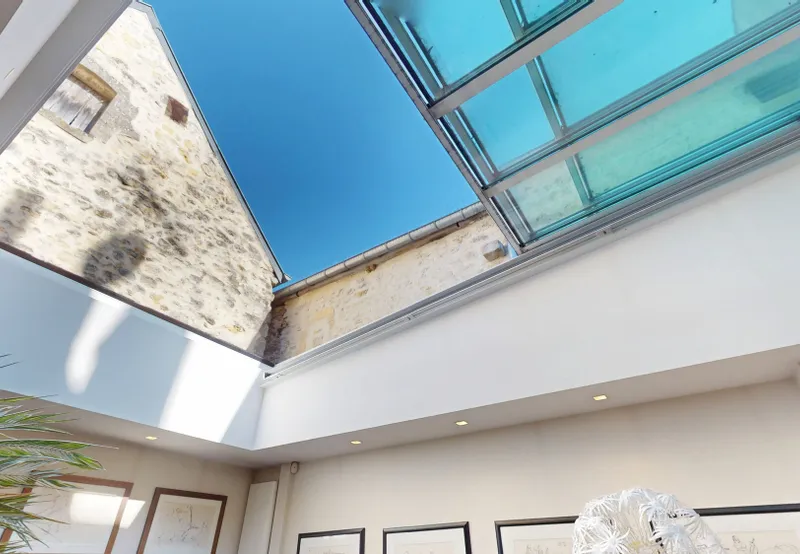 Un second salon, à l’esprit patio, se distingue par son toit escamotable, permettant de profiter pleinement des beaux jours tout en restant un espace habitable l’hiver. Un store vient également protéger du soleil lorsque nécessaire.