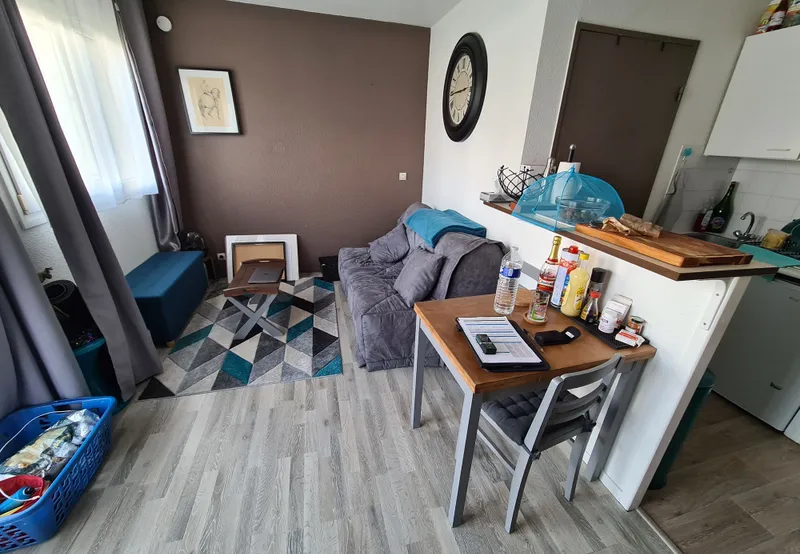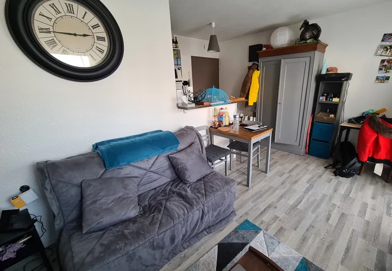 Ce studio est composé d'un séjour, un bar avec une cuisine ouverte aménagée/équipée et d'une salle d'eau avec WC.