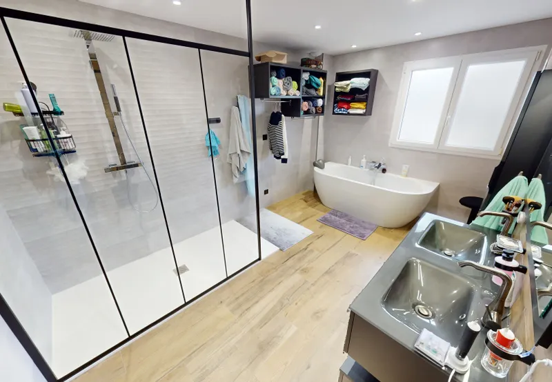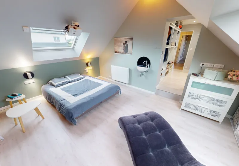 A l'étage un palier dessert 4 chambres SPACIEUSES dont une avec son propre dressing de 10 m2 avec Velux ÉLECTRIQUE programmable, une grande salle d'eau avec douche à l'italienne, baignoire et un double vasque.