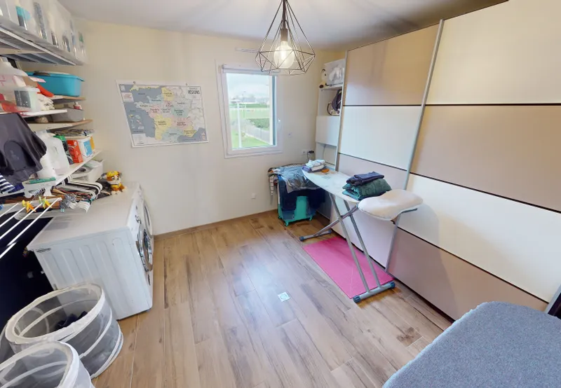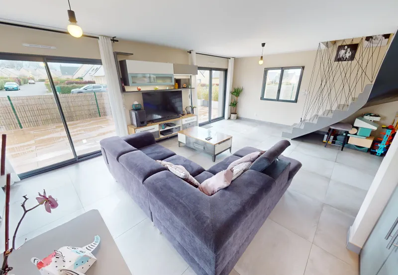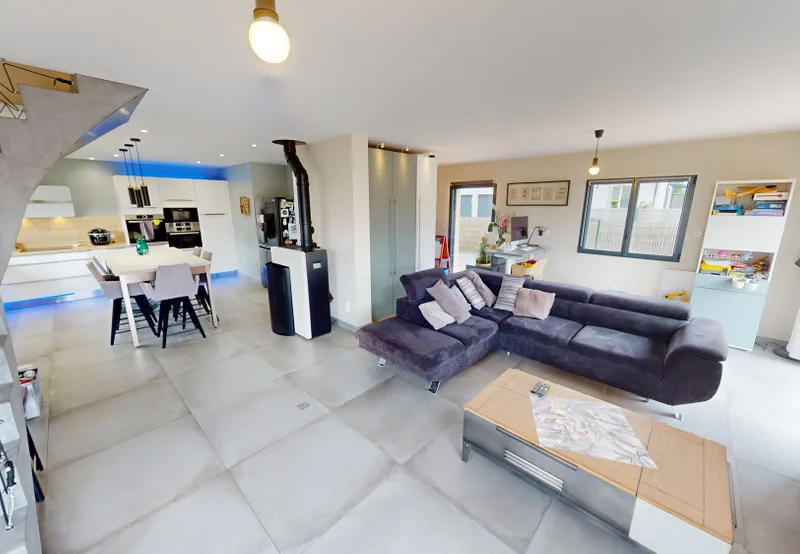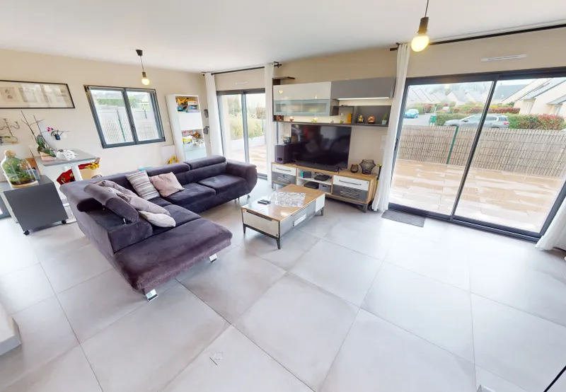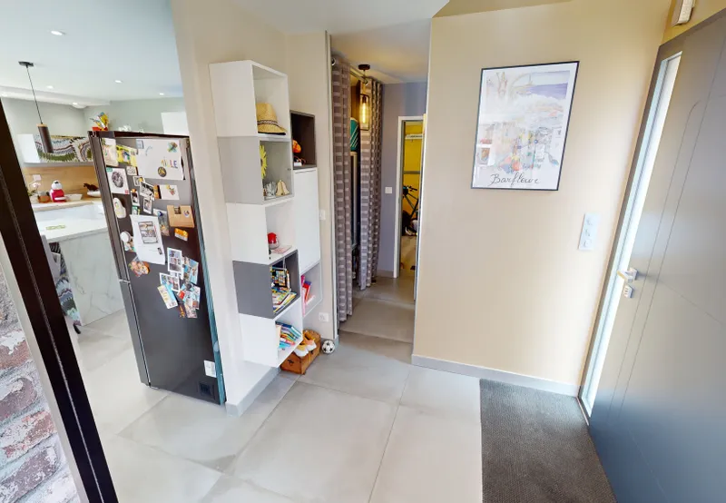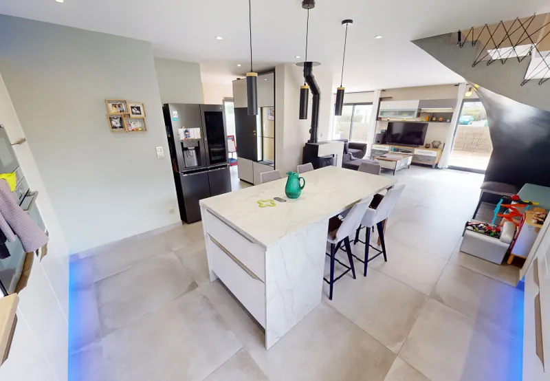 Cette maison se compose d'une entrée avec rangements et avec une porte biométrique (à reconnaissance d'empreintes digitales) donnant sur une TRÈS GRANDE pièce de vie de plus de 61 m2 composée d'un salon/salle à manger et d'une cuisine ouverte Arthur Bonnet AMÉNAGÉE/ÉQUIPÉE avec de nombreux rangements, le tout donnant accès à une terrasse NEUVE exposée SUD/SUD OUEST avec son STORE BANNE électrique.