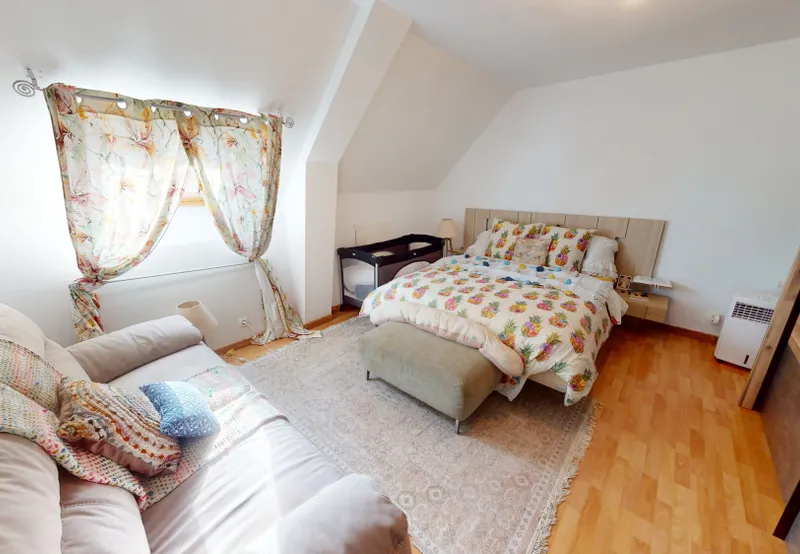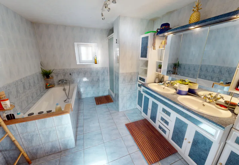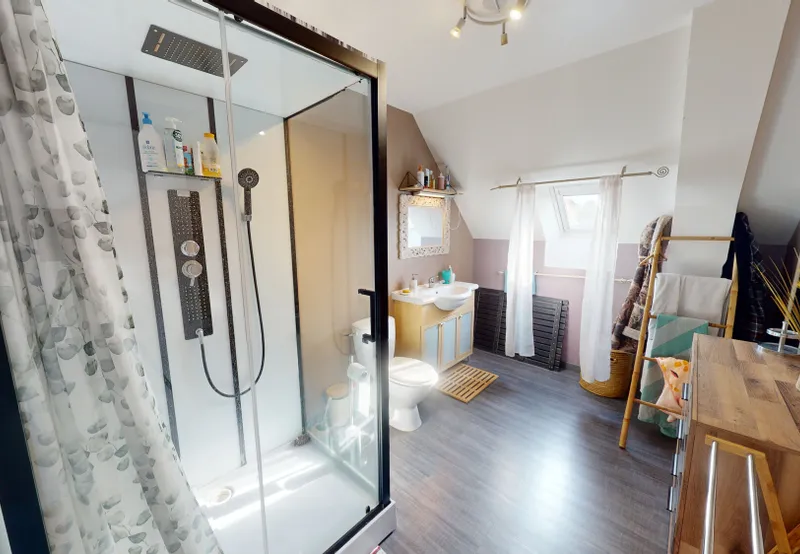 A l'étage, vous disposez de 3 GRANDES chambres de 11,13 m2, 13,43 m2 et 14,77 m2, un VASTE bureau idéal pour le télétravail ou pouvant faire office de salle de jeux ou de 5ème chambre de 14,15 m2, une salle d'eau avec meuble vasque et WC.