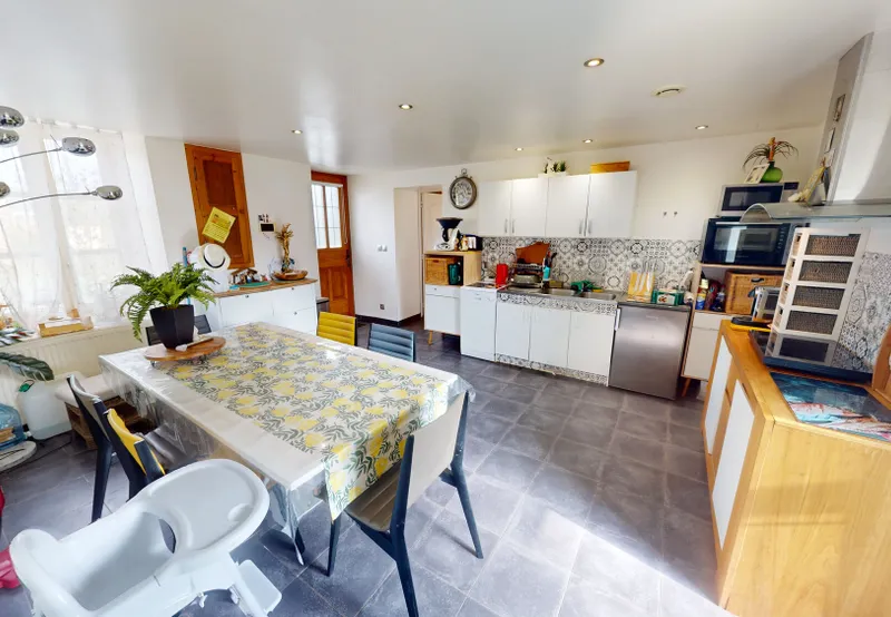 La maison principale style "LONGÈRE", se compose d'un GRAND salon de 28 m2, d'une cuisine SPACIEUSE de 22 m2 AMÉNAGÉE et ÉQUIPÉE, un couloir dessert ensuite un second salon de 17,33 m2, une salle de bain DOUBLE avec baignoire + douche et double vasque, une chambre SPACIEUSE de 13,54 m2 avec dressing intégré, un WC séparé avec placard buanderie, permettant ainsi la vie de PLAIN-PIED.