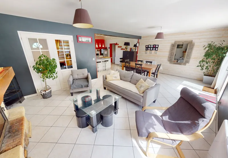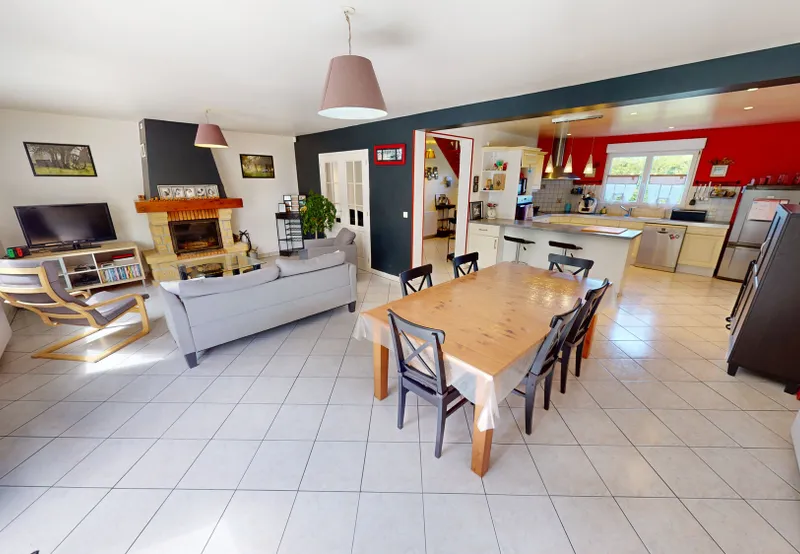 La maison se compose d’une GRANDE entrée desservant une pièce de vie SPACIEUSE de 52 m2 comprenant une partie séjour/salle à manger avec INSERT BOIS donnant accès à une terrasse exposée SUD/SUD OUEST, une cuisine ouverte AMÉNAGÉE ET ÉQUIPÉE et son arrière-cuisine de 16 m2.