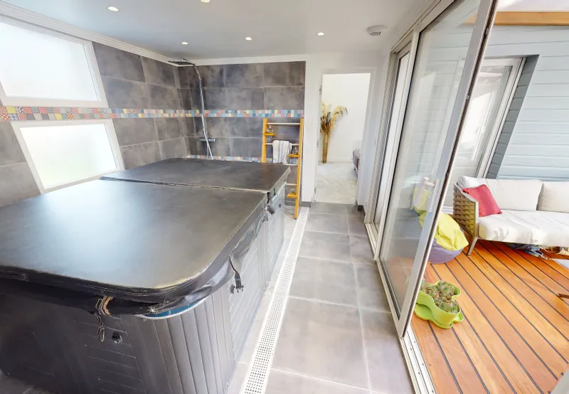 Vous disposerez aussi de DEUX TERRASSES ; une vitrée accessible par le spa et à l'extérieur avec pergola !