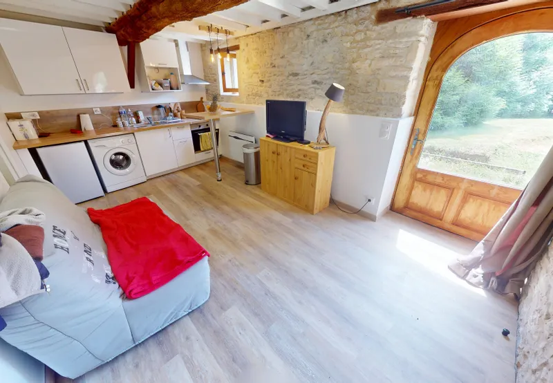 Le premier gîte avec terrasse, cosy avec ses 29 m², offre un bel espace de vie lumineux avec cuisine ouverte AMÉNAGÉE et ÉQUIPÉE, une salle d’eau avec meuble vasque, ainsi qu’un chambre, idéal pour un couple ou un séjour en solo.