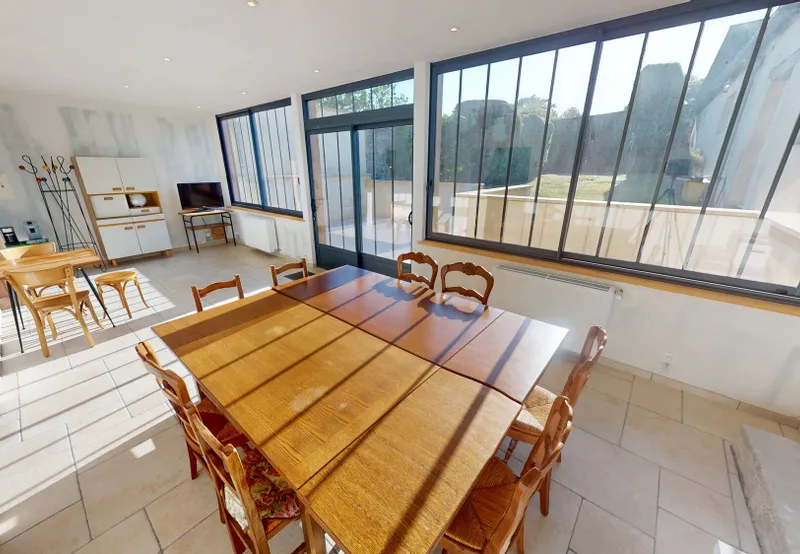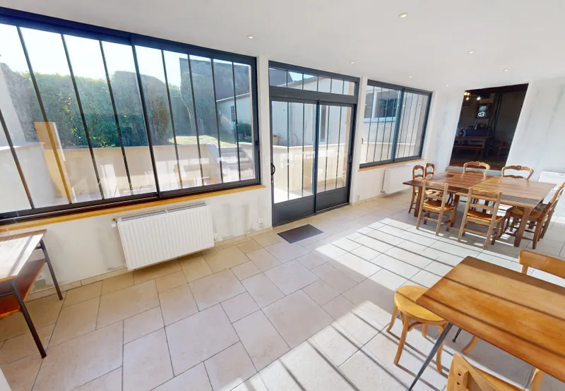 Elle offre au rez-de-chaussée une entrée qui dessert un SUBLIME SÉJOUR/SALON de 59 m2 dont une cave à vin, un second séjour de 29 m2 avec une cheminée (transformable en suite parentale pour une VIE DE PLAIN-PIED), une cuisine de 13,78 m2 une buanderie, une salle d'eau,et un wc indépendant. En complément, une magnifique véranda de 30 m2 donnant accès à une terrasse carrelée avec une EXPOSITION SUD qui est très recherchée et un double garage de 50 m2.