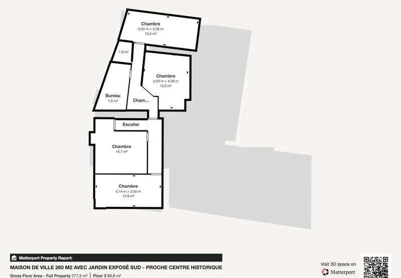 À l’étage, un palier dessert 1 bureau, 4 chambres de 13,06 m2, 13,31 m2, 14 m2 et 14,95 m2. Dans cette dernière chambre, un escalier est présent pour accéder aux combles isolées (33 m2 au sol) pouvant servir d'espace de stockage ou de créer un autre espace d'habitation. En complément, un wc indépendant. Il sera très facile de créer une salle d'eau supplémentaire.