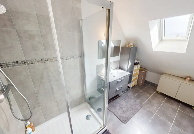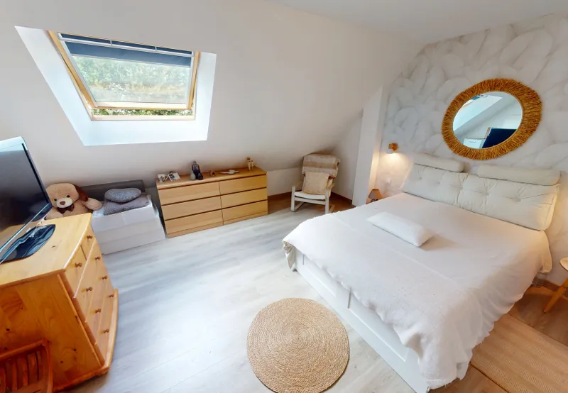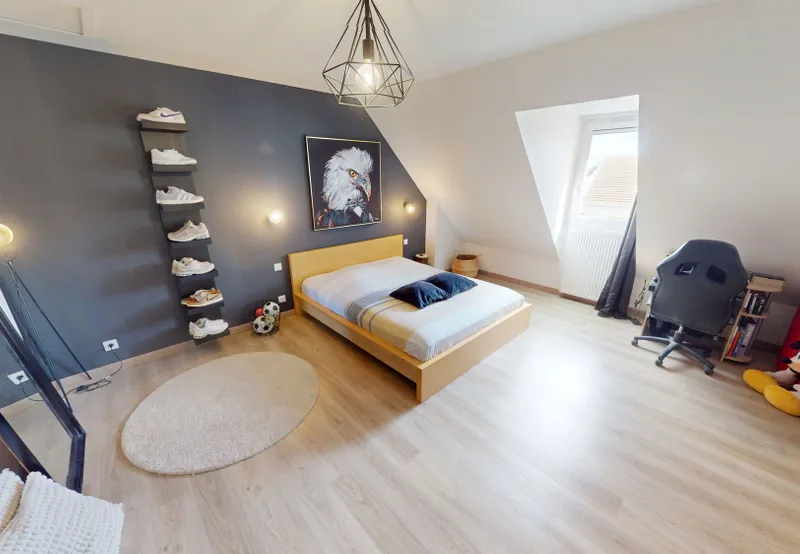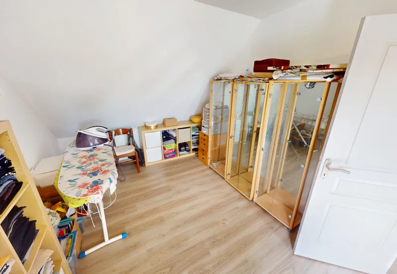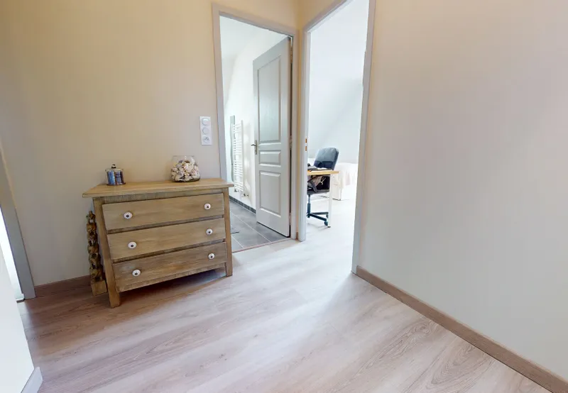 À l’étage, un palier dessert trois grandes chambres (20 m², 21,7 m² et 23,6 m² au sol), toutes avec rangements, ainsi qu’une salle d’eau et des WC séparés.