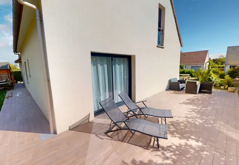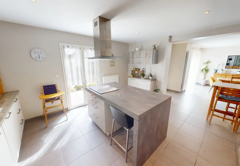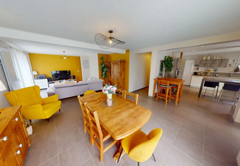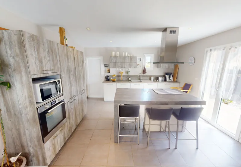 Au rez-de-chaussée, une entrée dessert une vaste pièce de vie de près de 60 m² comprenant un séjour lumineux avec salon et salle à manger d’environ 37 m², ouvrant sur une grande terrasse exposée SUD/SUD OUEST qui ceinture la maison. S’ajoute une cuisine aménagée et équipée ouverte avec îlot central et espace repas.
