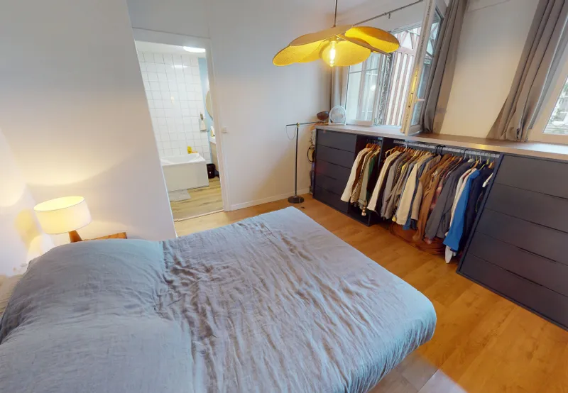 Il se compose d’un grand séjour-salon de 32 m2 exposé SUD avec beaucoup de charme (parquet, pierre apparente et hauteur sous plafond de 3 mètres), une cuisine AMÉNAGÉE et ÉQUIPÉE, deux chambres spacieuses, une salle de bains et un WC indépendant.