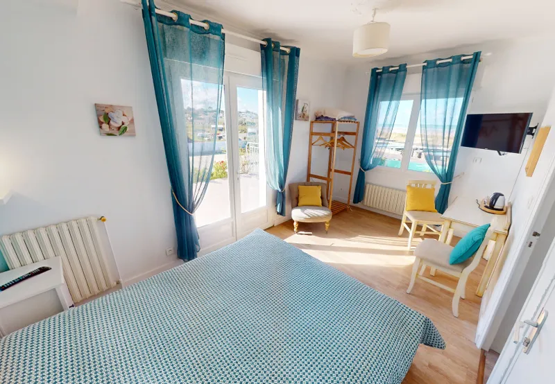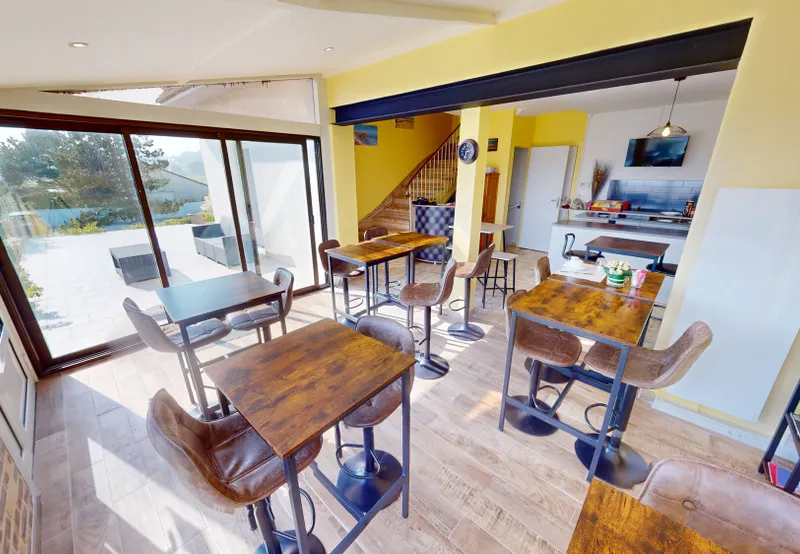 Pour la réception et les petits déjeuners, vous disposerez d'un grand espace avec 18 places assises et un accès sur la GRANDE TERRASSE de 50 m2 surplombant les plages.
